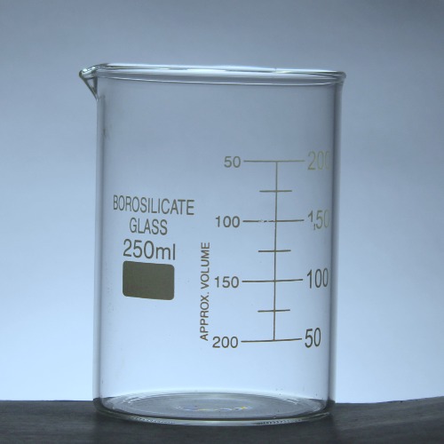 beaker is generally a cylindrical container with a flat bottom. Most also have a small spout (or “beak”) to aid pouring, as shown in the picture. Beakers are available in a wide range of sizes, from one millilitre up to several litres.